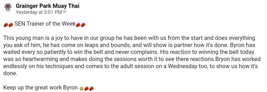 This week we received an email from Grainger Park Muay Tai Club, which Byron Bradshaw Year 8 Aidan House attends on a weekly basis, they confirmed what we already know about Byron in school but have gone on to give the following statement: